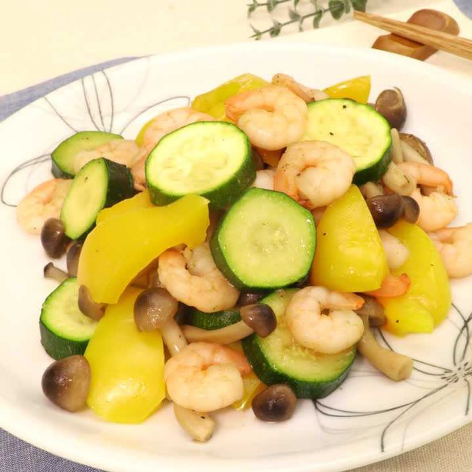 フライパンにオリーブオイルを入れて熱し、ズッキーニ、しめじ、えびを入れ全体に油がまわるまで炒める
