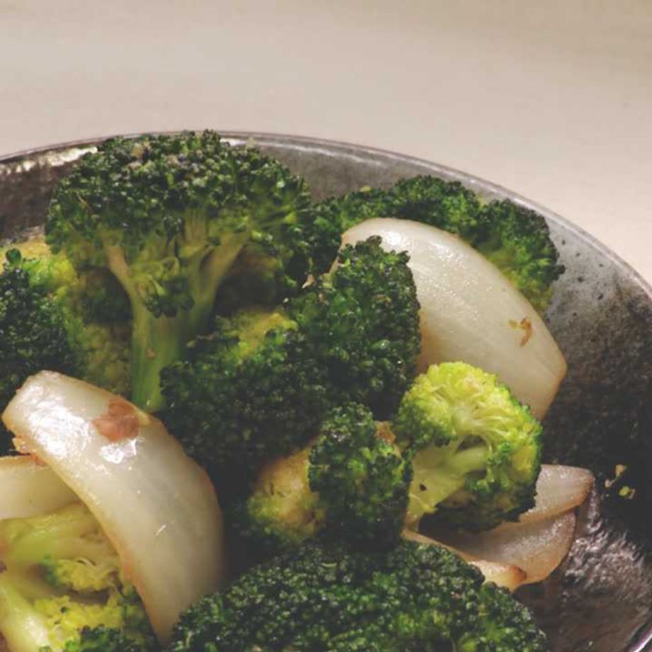 フライパンに油を入れて熱しブロッコリー、玉ねぎを入れて全体を焼き、アンチョビ、にんにく、塩、こしょうを加えて炒め合わせる