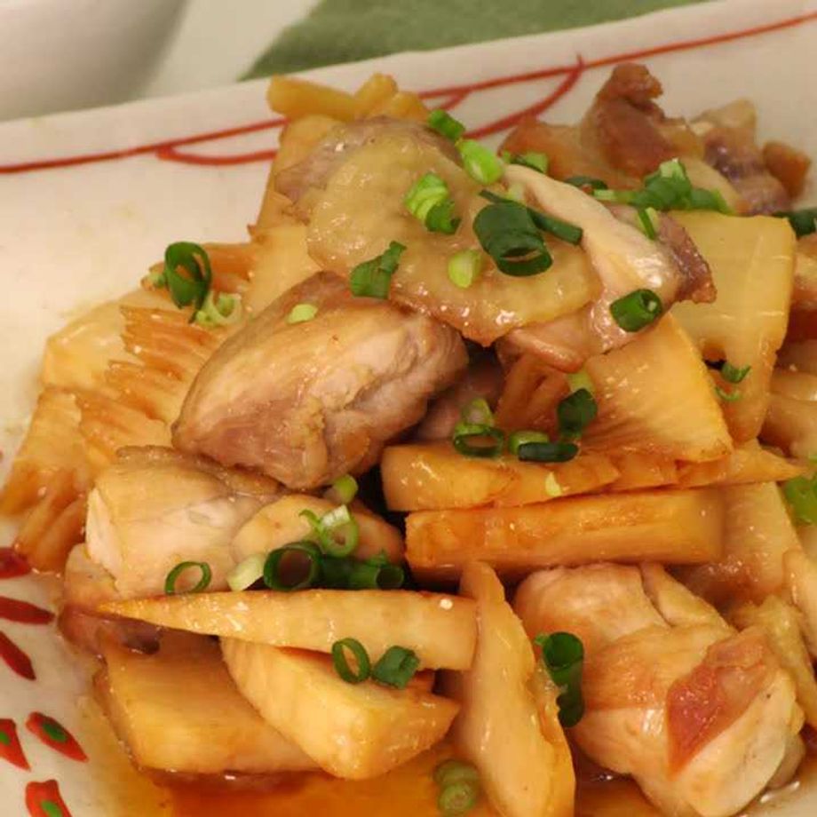 あいテレビ「金曜ほのボーノ!」で紹介されました! シャキシャキ食感のたけのこと プリプリ鶏もも肉を焼いて蒸すだけ。 お好みでラー油を適量加えるとピリ辛でさらに美味しく。