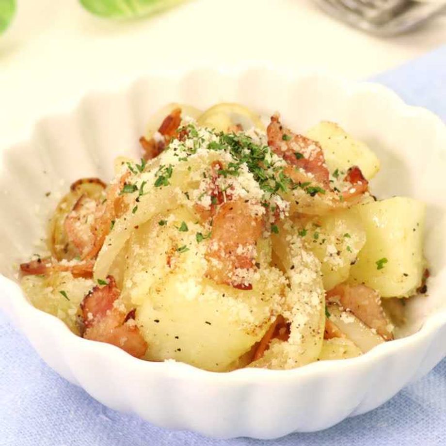 ベーコンとチーズでがっつり!じゃがいもの粉チーズ炒め♪ 玉ねぎの甘みとニンニクの香りがたまらない♪ おつまみにもオススメの、さっとつくれる簡単レシピです!