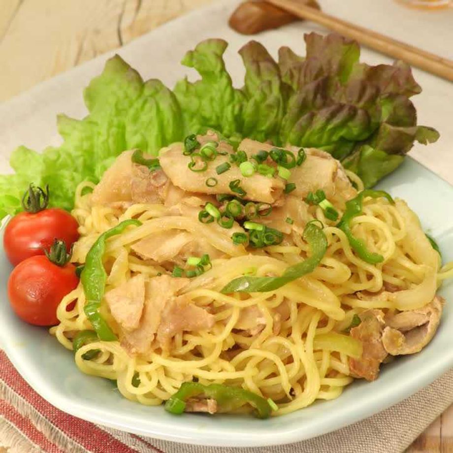 休日のランチに子供も喜ぶ、簡単ランチを! 定番の生姜焼きを焼きそばにしました♪ 甘辛いタレとしょうがの香りが食欲をそそる!