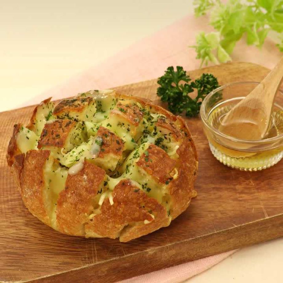 カンパーニュに格子状に切れ目を入れ、バターをぬる。パンの切れ目にピザ用チーズをはさみ、パセリをふる。