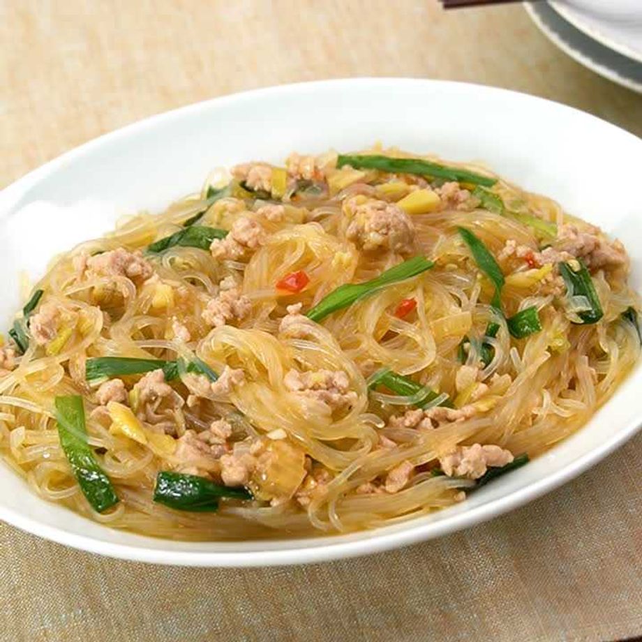 肉の色が変わったら中央をあけて豆板醤を加え、香りを立たせてから豚ひき肉と炒め合わせ、春雨を加えてさらに炒め合わせる。