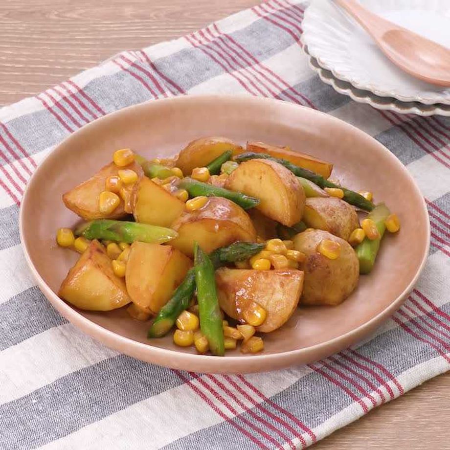 春らしい新じゃがとアスパラを使った、みそバターコーン炒め♪ みそバターのこっくりした味わいがたまりません! ホクホクの新じゃがでお口の中が幸せいっぱい♪