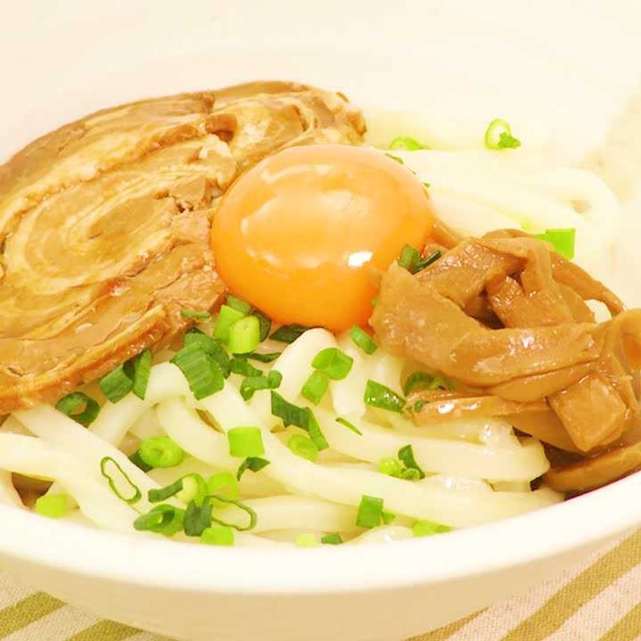 器に☆を入れて混ぜ、1のうどんを加え、チャーシュー、メンマ、細ねぎ、卵黄をのせる。