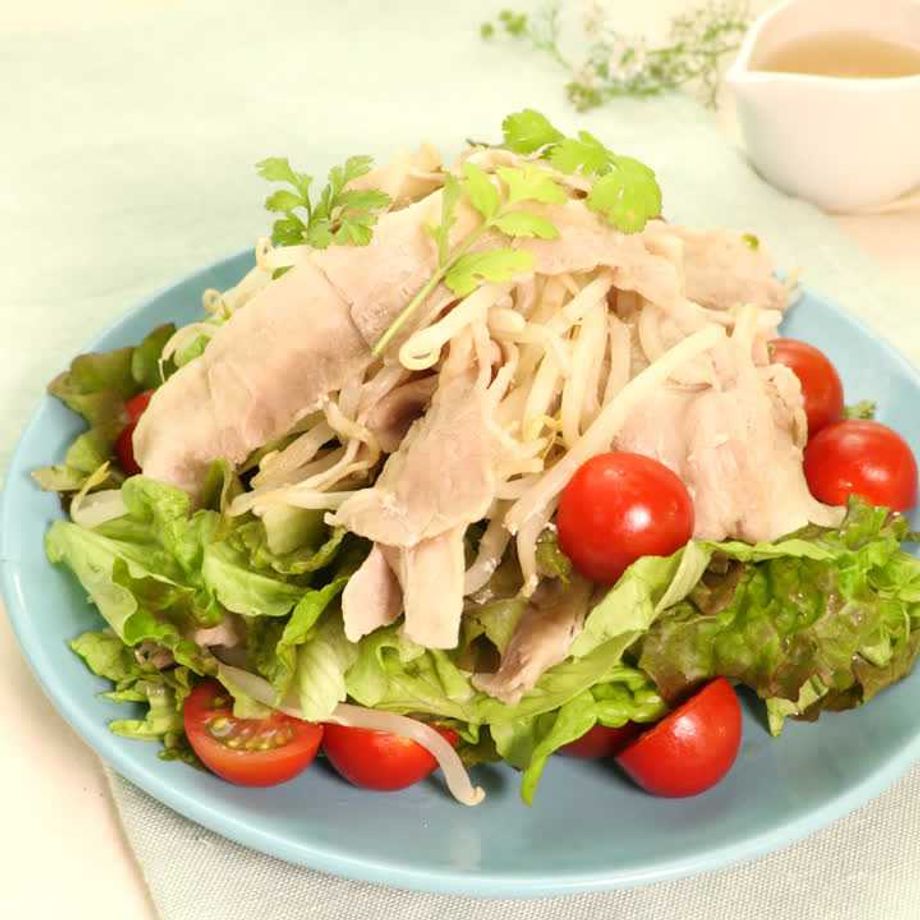 耐熱皿にもやしをのせ、上に豚ロース薄切り肉を重ならないようにのせてふんわりとラップをして600Wのレンジで4分加熱して水気を切って粗熱を取る。