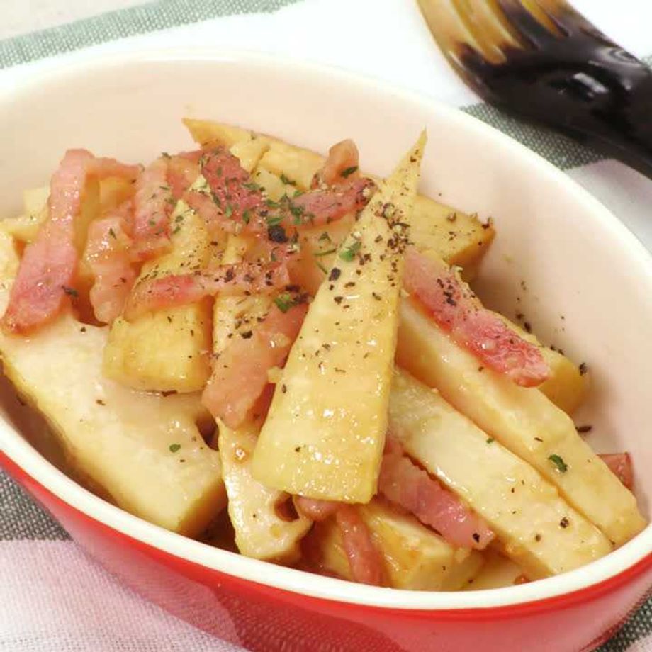 たけのことベーコンをマヨネーズとコンソメで炒めた、洋風レシピ!にんにくの香りが食欲をそそります。
