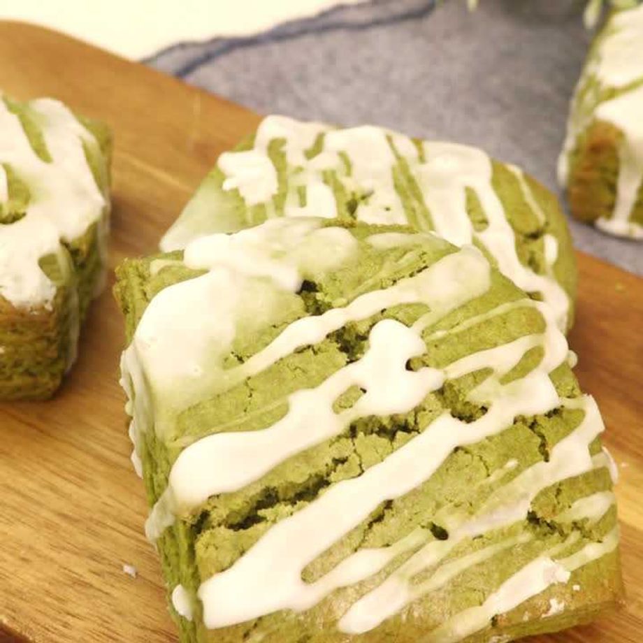 ホットケーキミックスとサラダ油でできる簡単スコーン! ほろ苦抹茶スコーンに練乳アイシングをかけて仕上げました! 練乳の甘さが抹茶の風味を引き立てます!