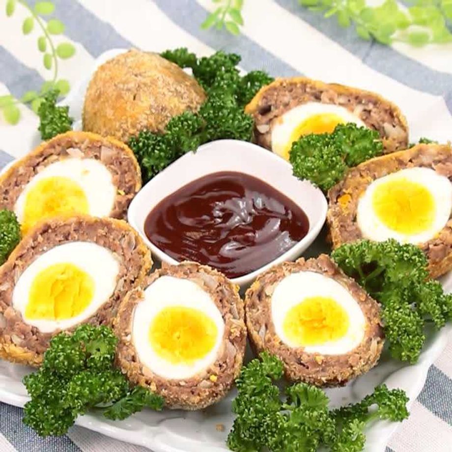 スコッチエッグとはゆで卵をひき肉で包んで焼いたり揚げたりして作るイギリス料理の一つ。切ったらゆで卵がひょっこり顔を出す、ボリュームおかずです。華やかな見た目は、パーティでも大人気♪意外と簡単に作れるのでぜひ、お試しあれ!冷めても美味しいのでお弁当にもおすすめです。