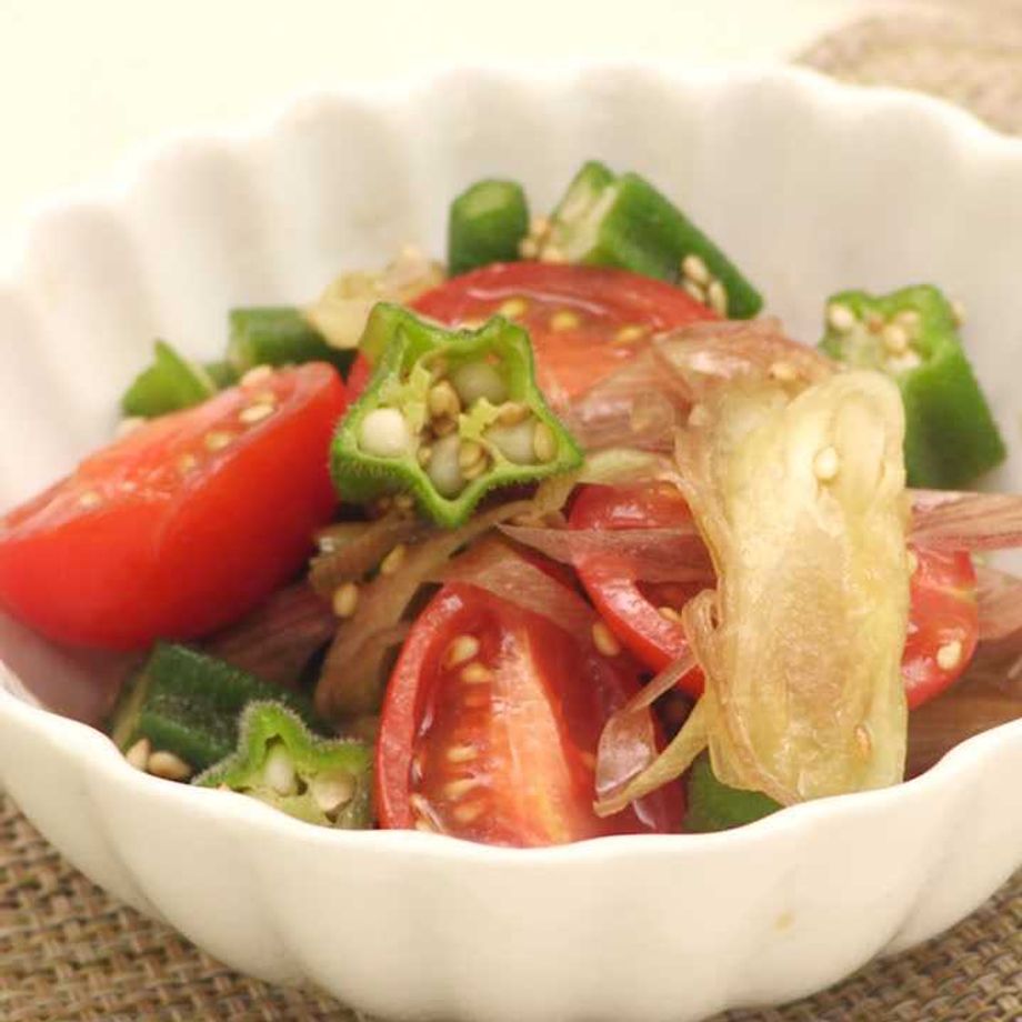 オクラは耐熱容器に入れ、ふんわりラップをかけ、600wの電子レンジで2分加熱する。ミニトマトは半分に切る。みょうがは薄切りにする。加熱したオクラはざく切りにする。