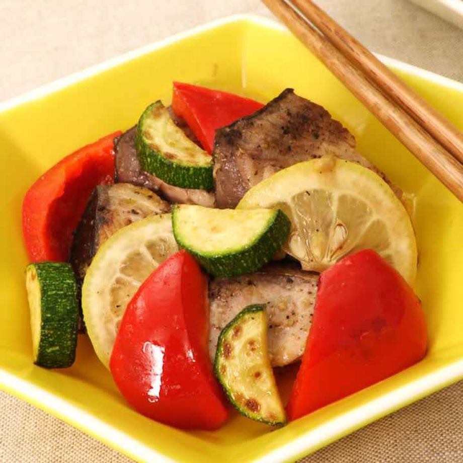 フライパンにサラダ油半量を入れて熱し、ズッキーニ、パプリカを入れて中火で焼く。