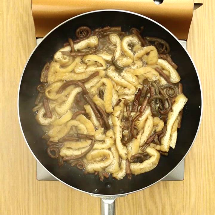 鍋にサラダ油を熱してゼンマイを炒め、油がまわったら油揚げを加える。