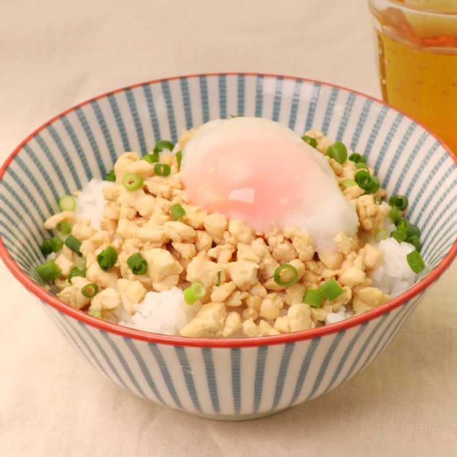 器にごはん、豆腐そぼろを盛り、細ねぎ、温泉卵をのせる。