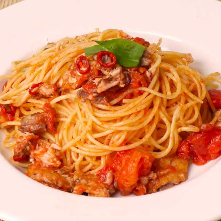 イワシはこんがりと焼いてトマトソースと絡めます♪ にんにくの香りと唐辛子の辛みがたまりません!