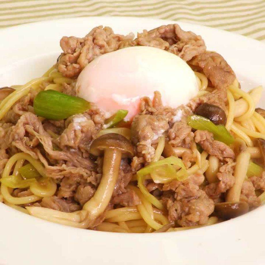 甘辛のパスタに温玉がとろ〜り!牛肉、野菜もたっぷり1皿で満足のいく1品!定番パスタに飽きたら是非お試しあれ!
