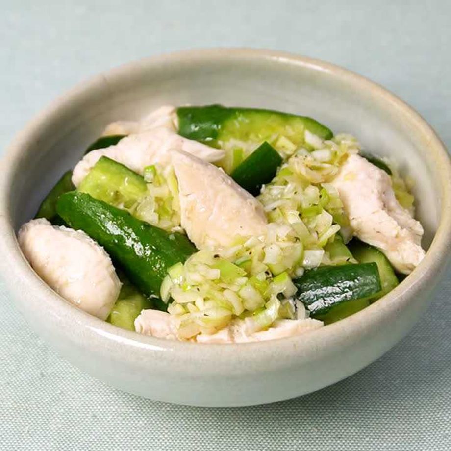 ☆を混ぜ合わせる。 器にささみ、きゅうりを盛って混ぜ合わせ、ねぎ塩だれをかけたら完成!