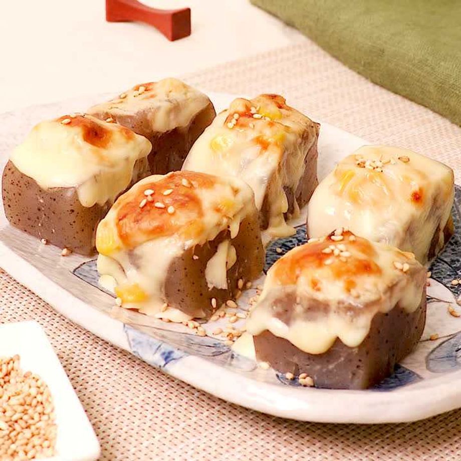 こんにゃくに2のソース、チーズをのせる。天板にのせてトースターで焼き色がつくまで焼き、お好みで白いりごまをかける。