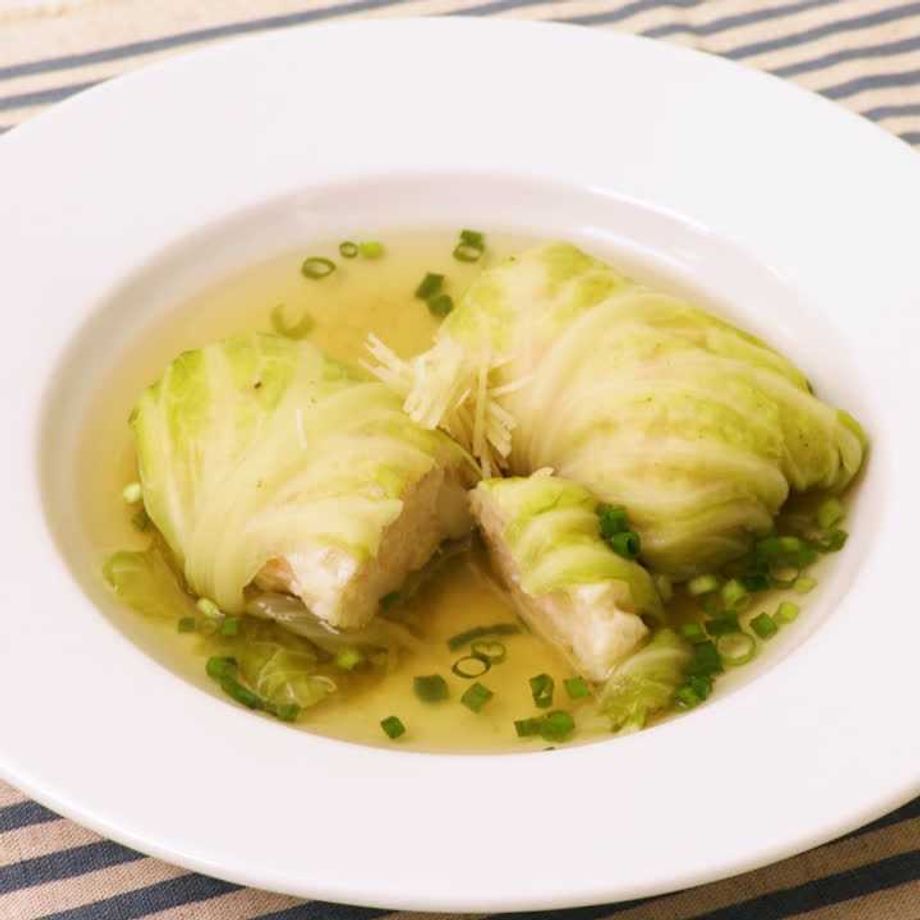 むきえびをタネにし、和風に仕上げたロールキャベツ♪ふわっとプリプリのタネにあっさり和風スープが染み込む! たまらない美味しさです♪