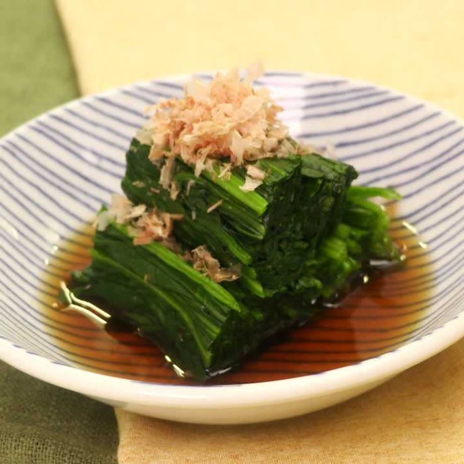 - 4 - ほうれん草をよく絞り、4cmの長さに切る。2に浸す。器に盛り付け、かつお節をかける。 - ポイント - ほうれん草は水気をよく絞ってから調味料と合わせると水っぽくならずに仕上がります。