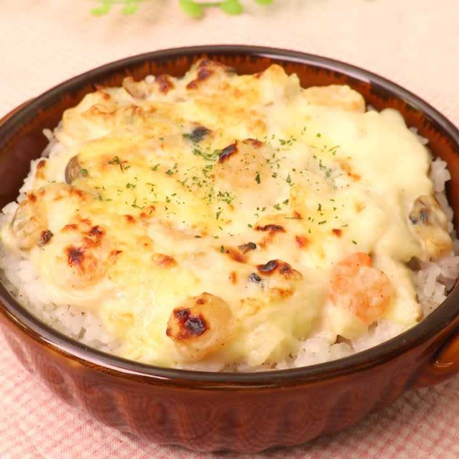 耐熱容器にバターライス、シーフードソース、ピザ用チーズをのせて、オーブントースターで焼き色がつくまで5分ほど焼く。