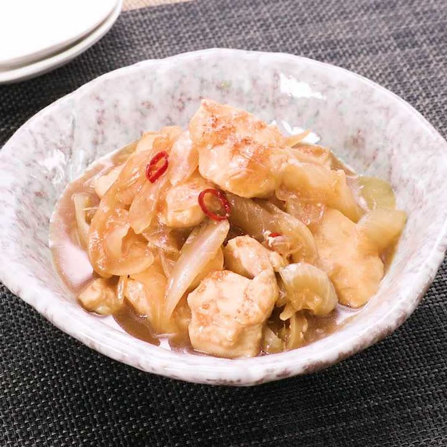 フライパンにサラダ油を入れて熱し、フライパンの片側にささみを入れ、空いている部分に玉ねぎを入れ、中火で焼く。