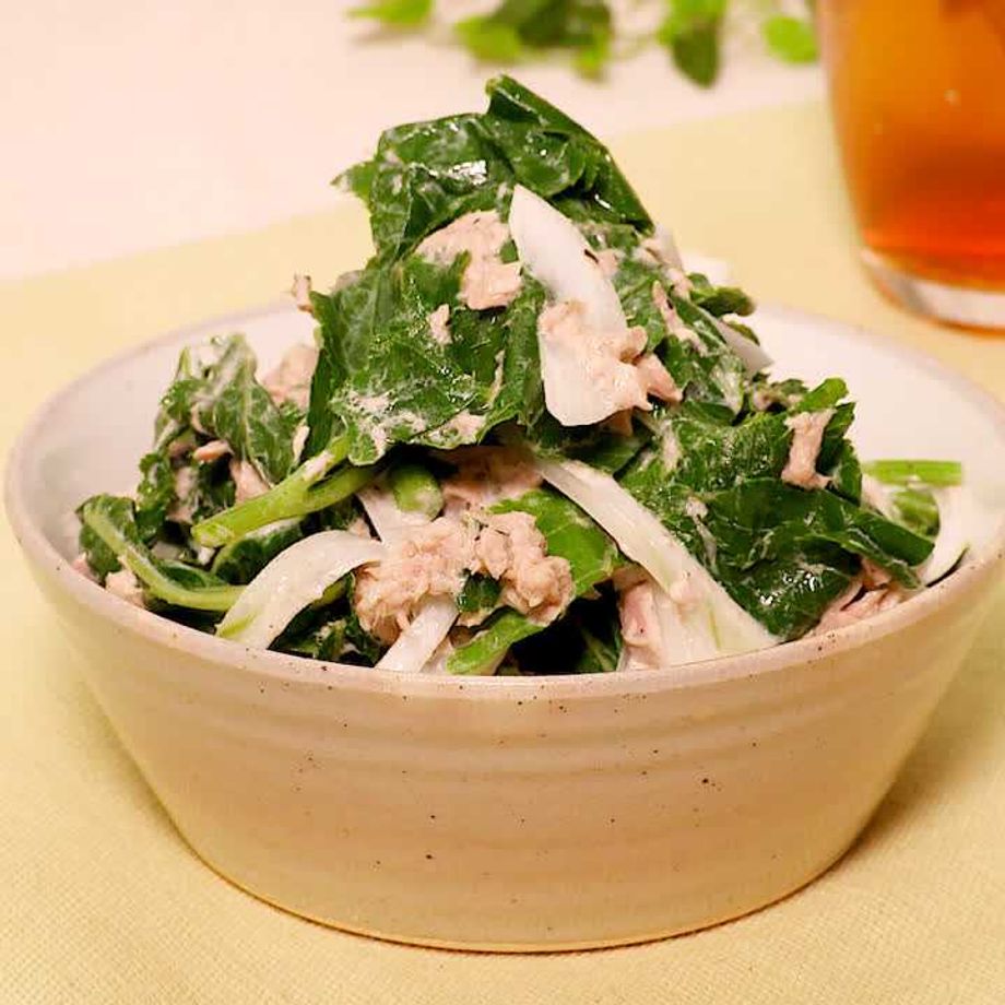 ボウルにあしたば、玉ねぎ、ツナ缶、マヨネーズ、塩こしょうを入れてあえる。