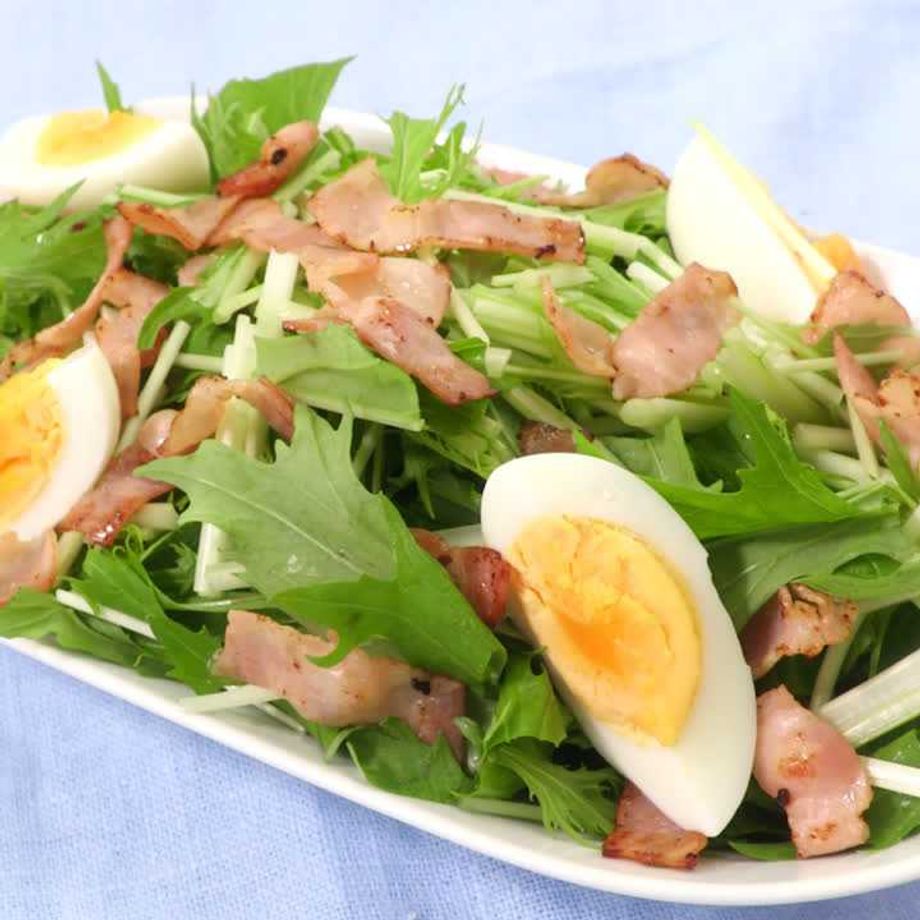 シャキシャキ感がおいしい「水菜とゆで卵のサラダ」を紹介します。水菜の代わりにサラダほうれん草やベビーリーフを使ったアレンジもおすすめです!マヨネーズを加えることで、コクのある味わいの自家製ドレッシングに仕上げました!ベーコンはカリッと仕上げてサラダのアクセントに♪