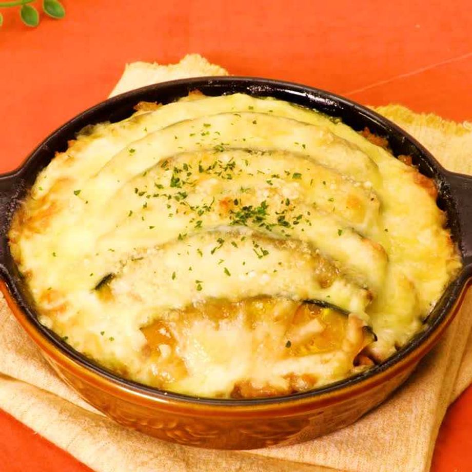 耐熱容器にかぼちゃ、加熱したミートソースを順に重ねて入れ、ピザ用チーズ、粉チーズをのせる。トースターで焼き色がつくまで7〜10分焼く。パセリをちらして完成。