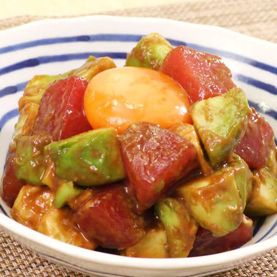 加熱不要、切って和えるだけの簡単メニューです! にんにく香る、コチュジャンのピリ辛ユッケだれと アボカド、卵黄のまろやかさがからんで絶品♪