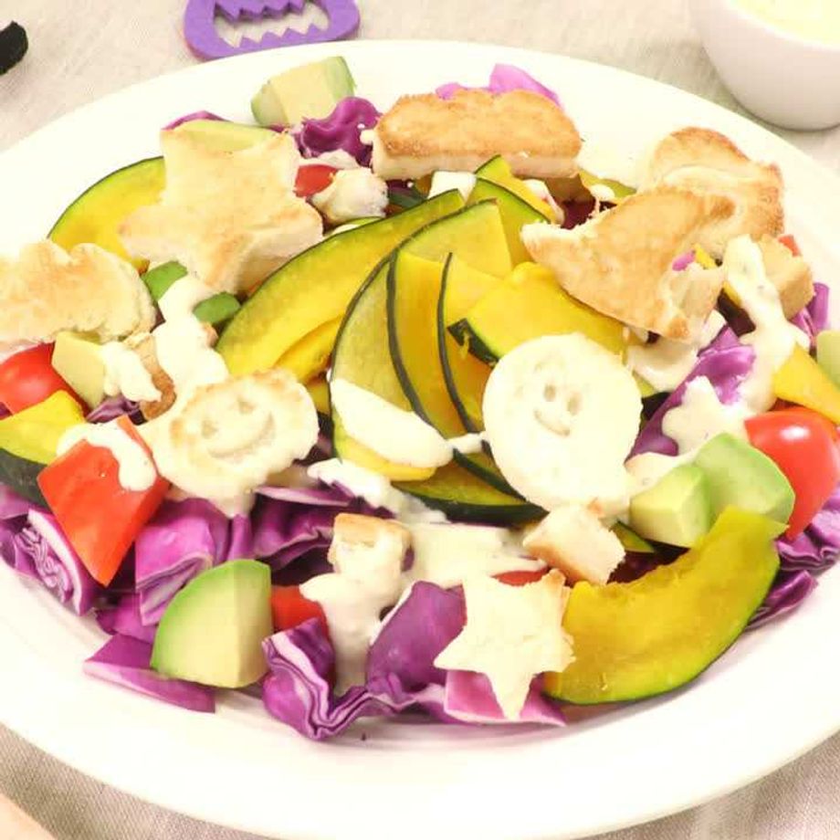 カラフルな野菜と、食パンでくり抜いたハロウィンモチーフの クルトンが可愛いサラダです♪ ハロウィンパーティーに大皿で作ってみて下さい♪