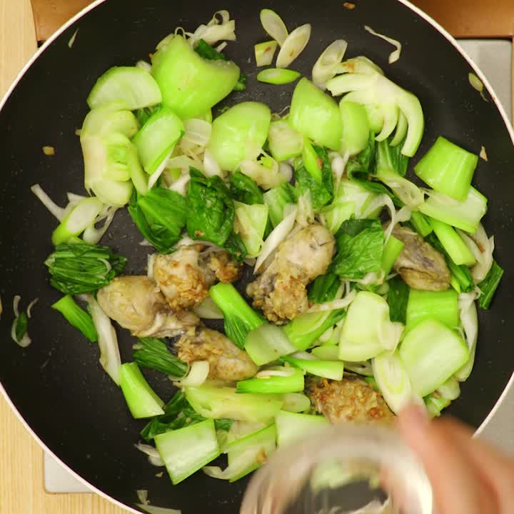 チンゲン菜の葉、ねぎを加えてしんなりするまで炒め、牡蠣を戻し入れる。