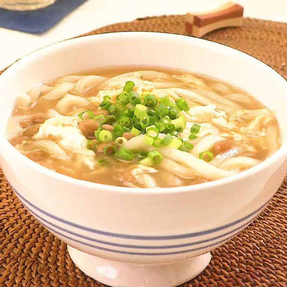 めんつゆ、納豆を入れて混ぜ、卵を溶いて回し入れる。卵が浮いてきたら火を止めて一混ぜする。器にうどんを盛り付け、汁をかけ、細ねぎをちらして完成。