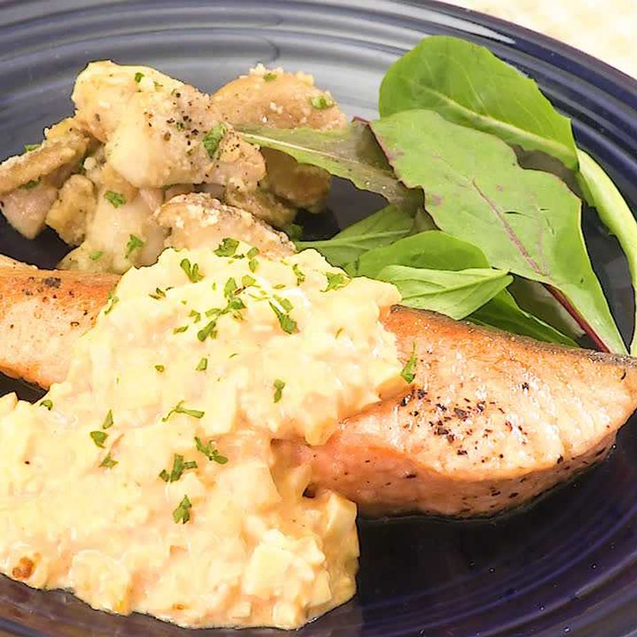 フライパンにバターを入れて熱し、鮭を入れて両面に焼き色がつくまで弱火で焼く。器に鮭を盛り付け、オーロラタルタルをかける。