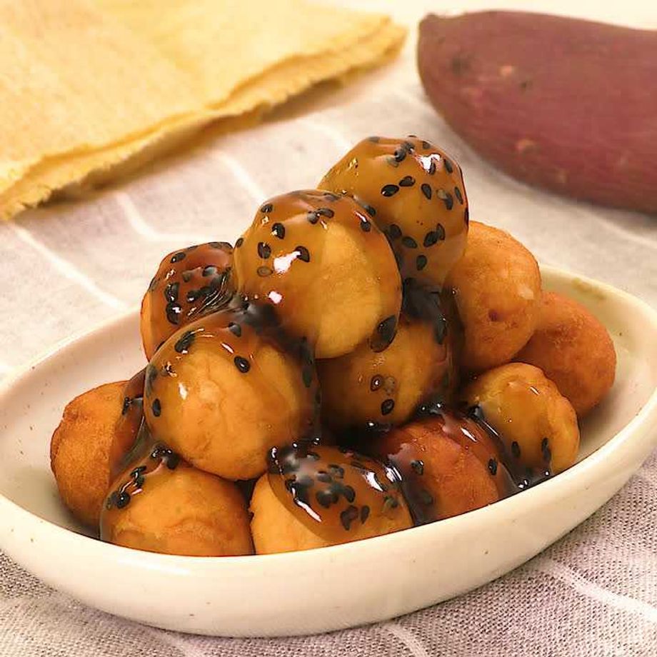 さつまいもと片栗粉で作るもっちもち団子に!甘辛ダレをかけた大学芋風おやつです。ついついつまんじゃうクセになる美味しさ♪