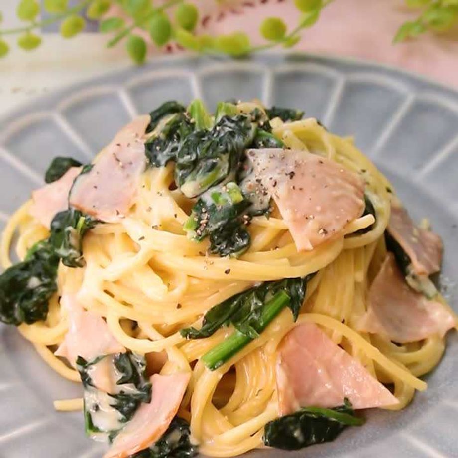 - みやまり ハム→ベーコンに変更、ブラックペッパーたっぷりにしました。簡単で美味しかったです。他の方のレビューを参考に、とろみをつけすぎないようにしましたが少しもったりした感じになりました。ほぼとろみをつけずにスープパスタっぽく作っても美味しかったです。スパゲッティはゆで時間を1分短くしてちょうど良かったです。冷凍ほうれん草200グラムを使ったのでより楽でした。