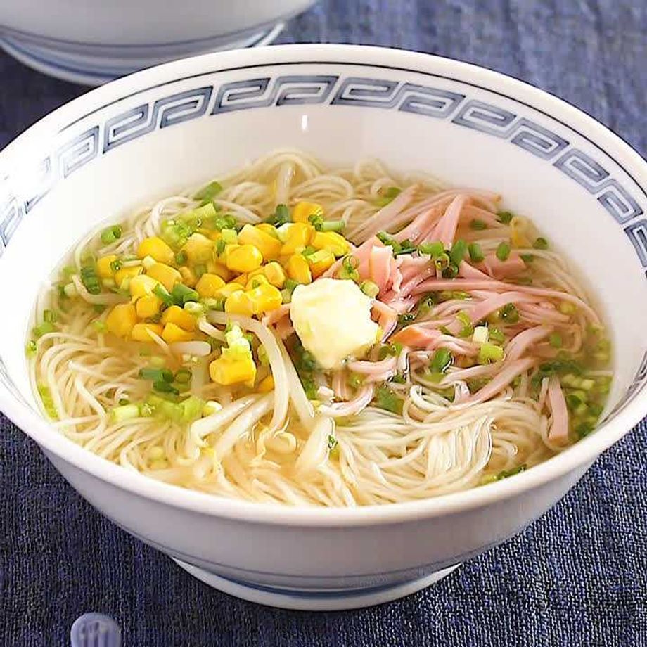 そうめんでヘルシーに代用!コーンとバターが塩味のスープとよく絡み合います♪