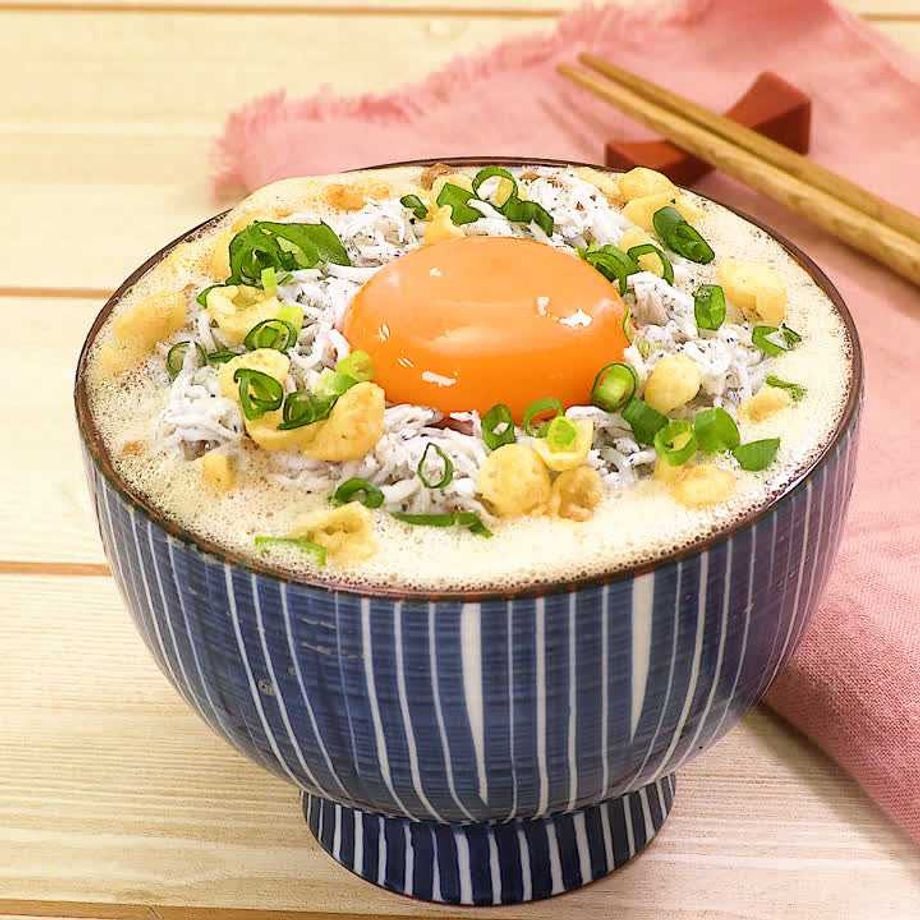 器にあたたかいごはんを盛り、1、しらす干しをのせる。中央に卵黄をのせ、揚げ玉、細ねぎをちらす。