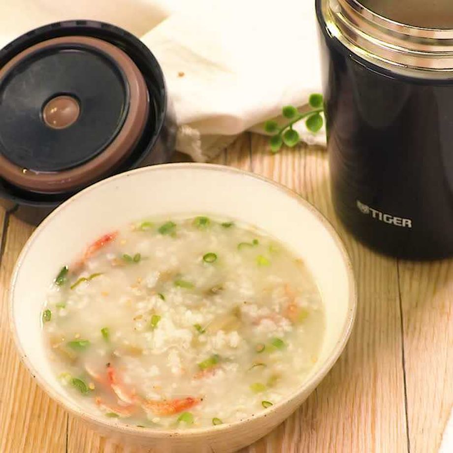 朝、ごはんにお湯を注いで出勤したらあら簡単! スープジャーの中でおかゆが出来上がり! しょうが入りで身体ポカポカになれる中華粥のレシピです!