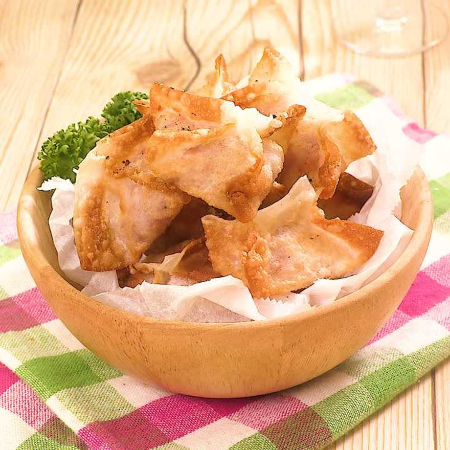 フライパンにサラダ油を入れて180℃に熱し、ワンタンを入れて表面がきつね色になるまで揚げる。