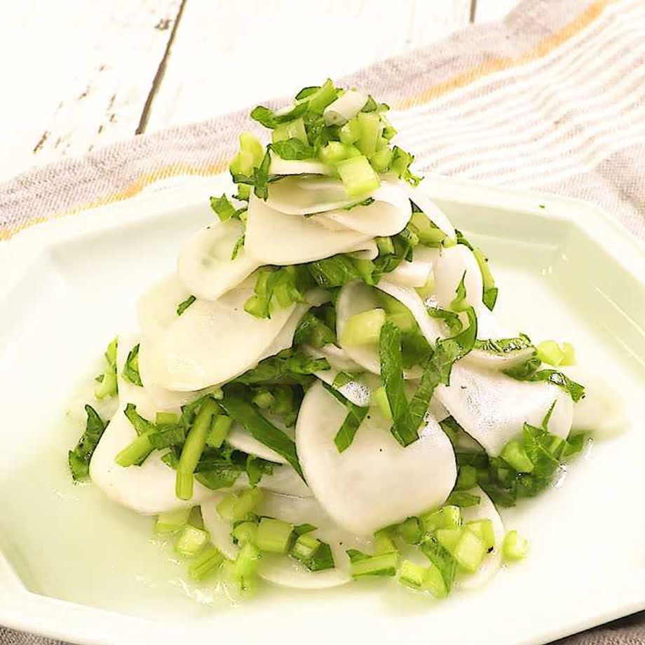 皮も葉も全部食べられるカブのサラダ♪にんにくが効いたパンチのあるドレッシングがカブのおいしさを引き立ててくれるでしょう。食材はひとつ、切って和えるだけなのでとても簡単です!