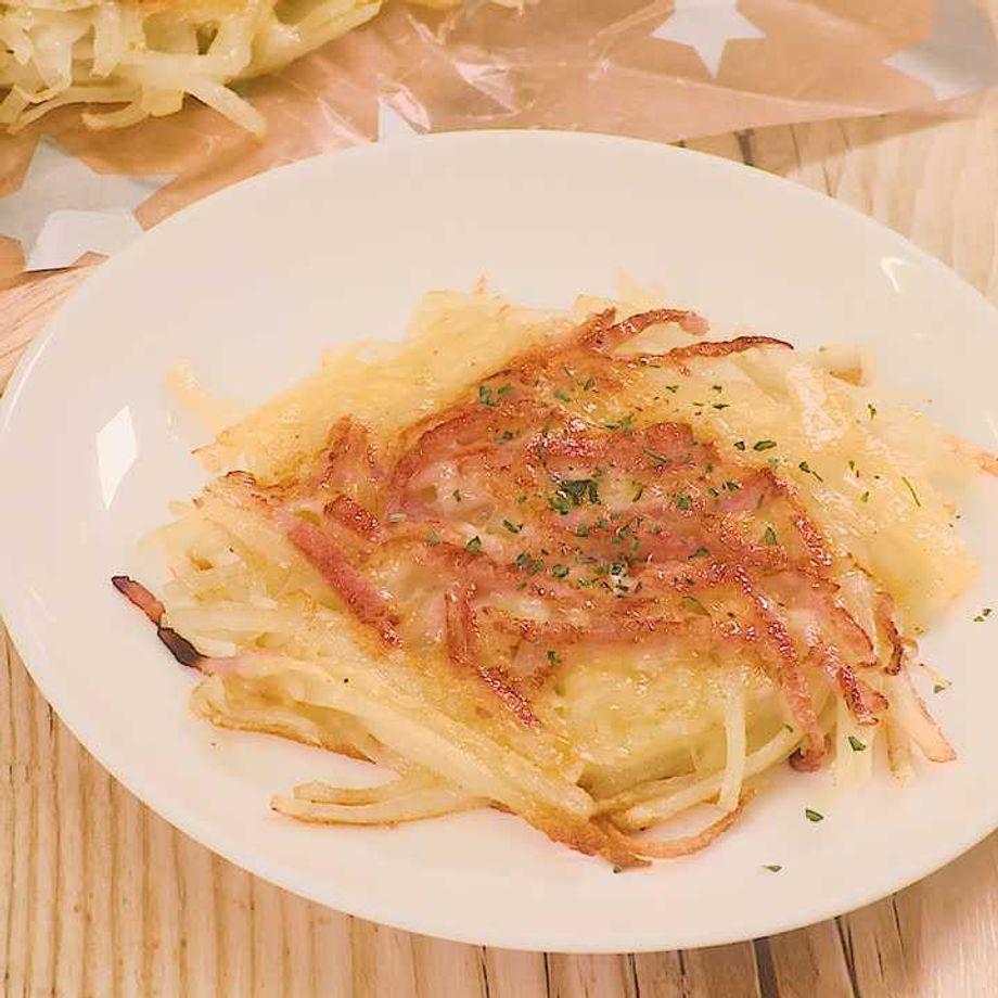 焼き色がついてきたらチーズ、ベーコンをのせてさらに1分ほど焼き、裏に返してチーズが焼けるまで2〜3分焼く同様に繰り返す。
