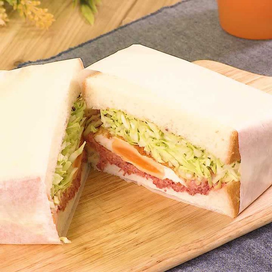 1枚にキャベツ、卵、コンビーフをのせ、もう1枚の食パンをのせてクッキングシートで包み、半分に切る。