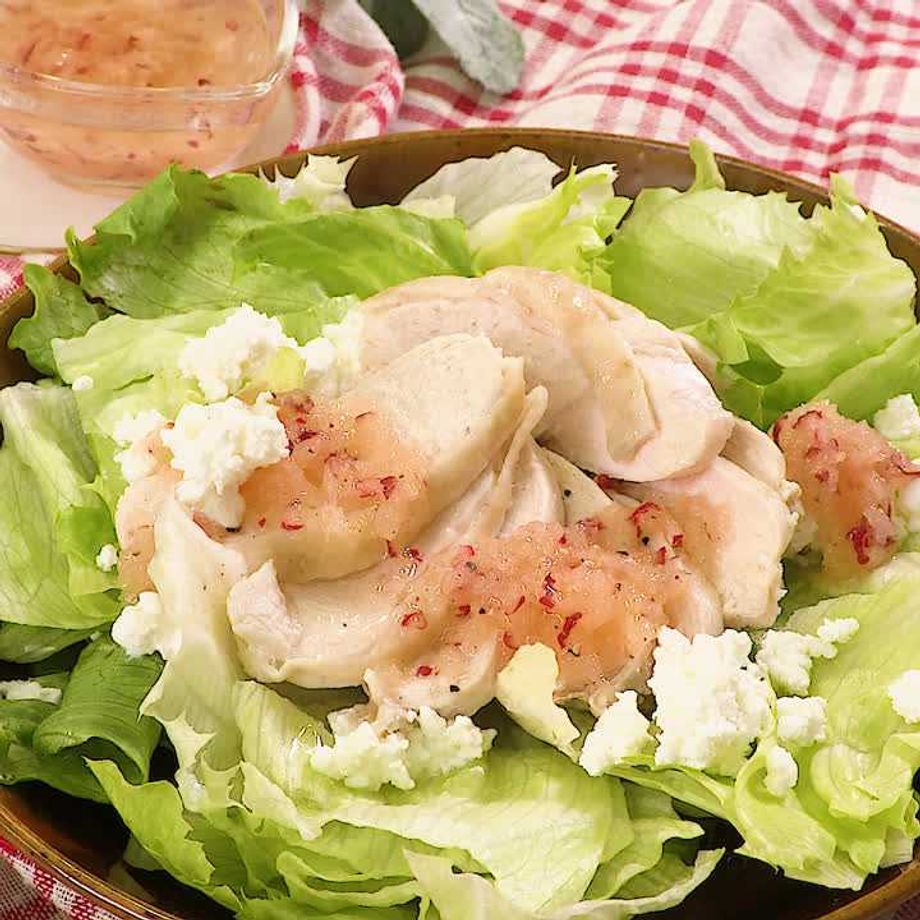 りんごを使ったフルーティなドレッシング! りんごが少し余った時に作っておくと重宝しますよ♪ 蒸し鶏もレンジで作るのでお手軽です!