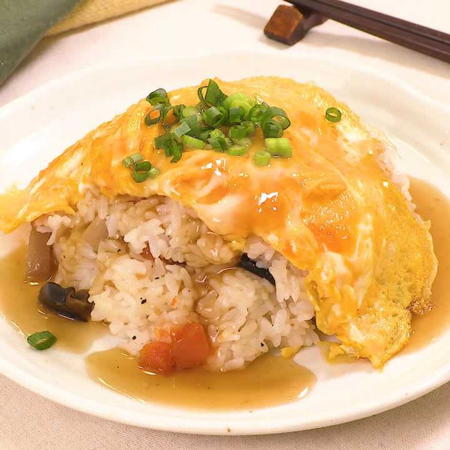 4のフライパンをキッチンペーパーでさっと拭き、残りのごま油(大さじ1)を入れて中火で熱する。溶き卵を入れて半熟状になるまで菜箸で手早く混ぜる。2等分にし、4の器に盛ったごはんにのせる。