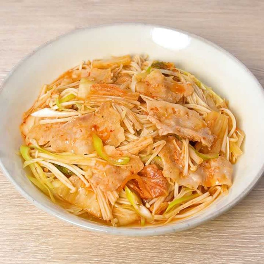 耐熱皿にえのき、豚肉、キムチ、ねぎをのせて酒、塩こしょうをふりふんわりとラップをし、600Wのレンジで4分ほど、肉に火が通るまで加熱する。ポン酢しょうゆをかけて完成。