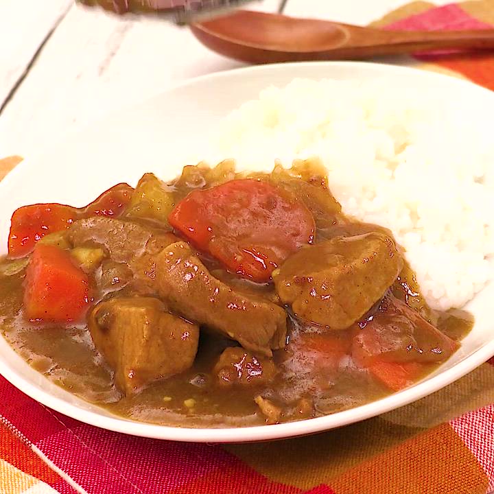 豚肉の豊かな旨味が美味しいポークカレーです。 豚肉特有の甘みのある味わいについついスプーンが進みます♪ ルーに溶け出す様々な旨味のハーモニーを味わってください♡