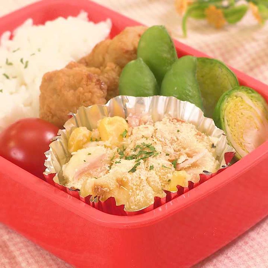 お弁当でも大人気のグラタンが 火を使わずレンジとトースターでできちゃいます! ハムとコーンが入って見た目華やかに仕上がります♪