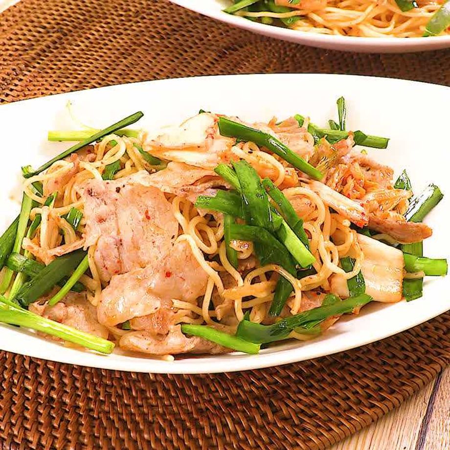 フライパンにごま油を入れて熱し、豚肉を入れて肉の色が変わるまで中火で炒める。蒸し中華麺、キムチ、たれを加え、混ぜながら炒める。