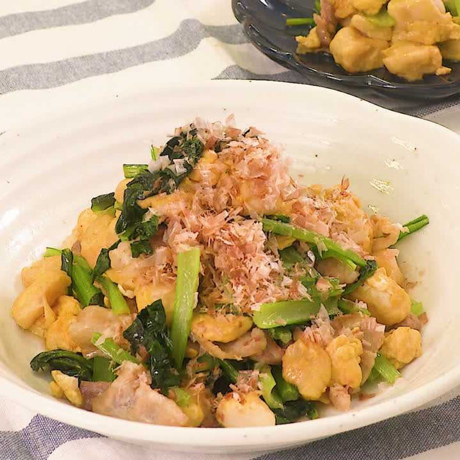ごま油を加え、豚肉を入れて火が通るまで炒める。豚肉に火が通ったら小松菜と取り出した麩を加えてさらに炒める。器に盛り、かつお節をのせる。