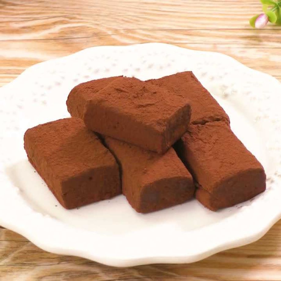 バットにラップを敷き、チョコレート液を流し入れて平らにならす。冷蔵庫で1時間ほど冷やし固めて、食べやすい大きさに切り、純ココアを全体にまぶす。